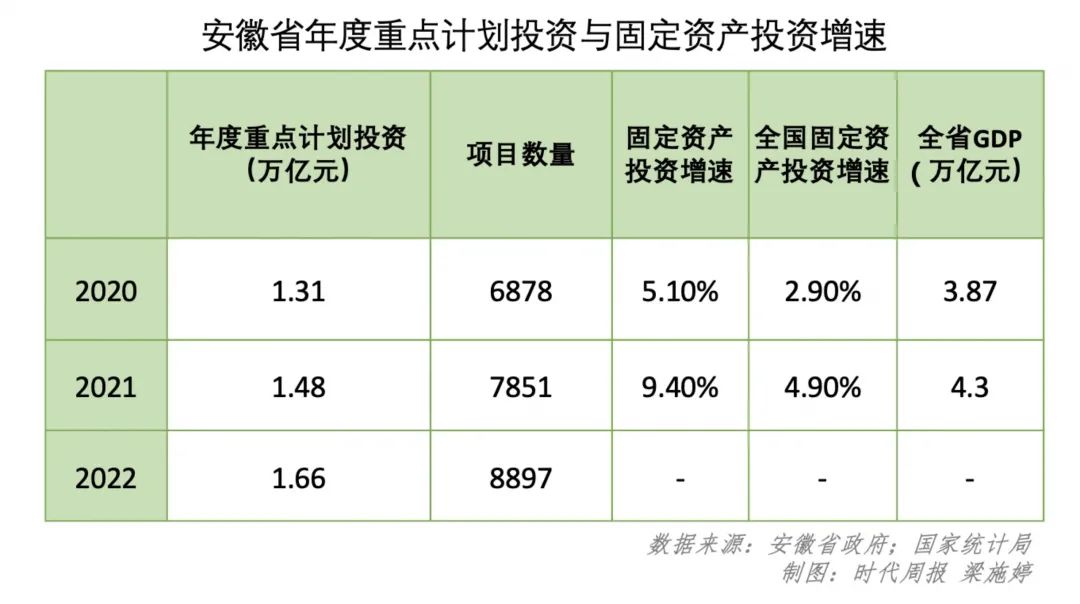 時代周報記者梳理發(fā)現(xiàn),近三年來,安徽省的年度重點計劃投資均在1萬億元以上,是名副其實的投資大戶。